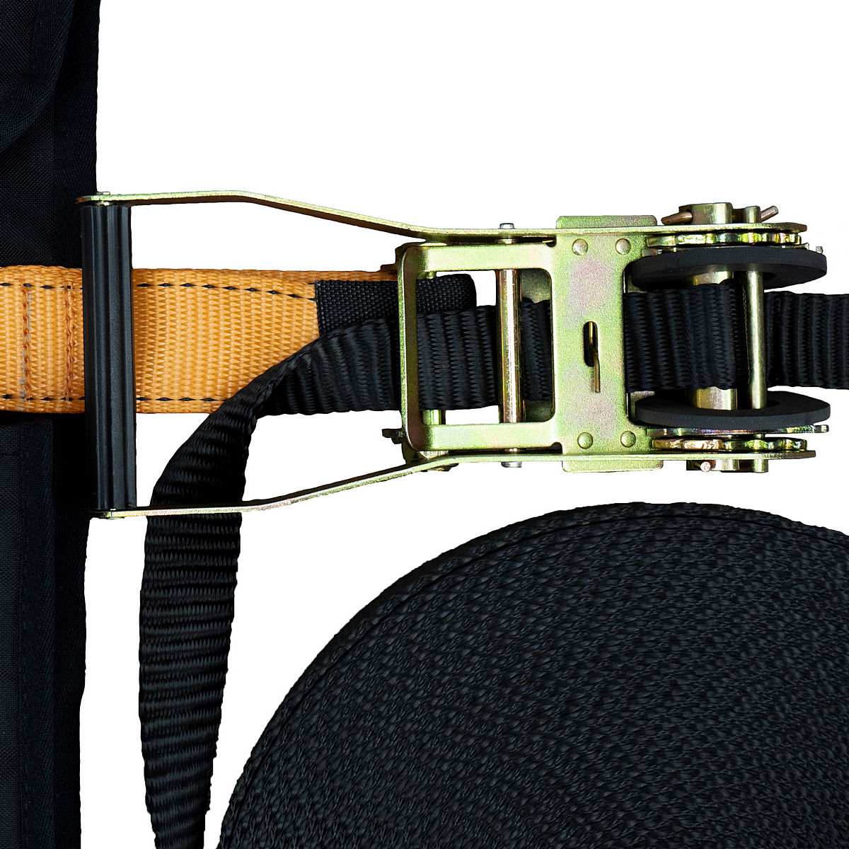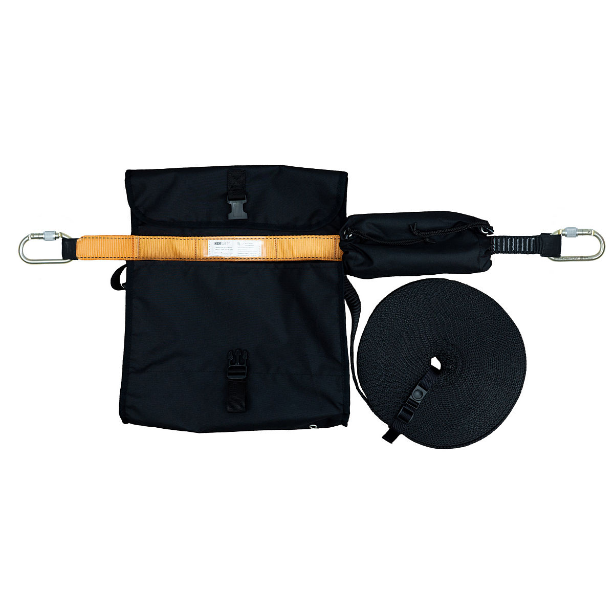 Временная анкерная линия HS-AE320 состоит из текстильной анкерной линии, устройства регулировки натяжения, двух карабинов и интегрированной сумки для хранения и транспортирования. Концы анкерной линии сшиты таким образом, что образуют соединительные петли, в которые установлены карабины.