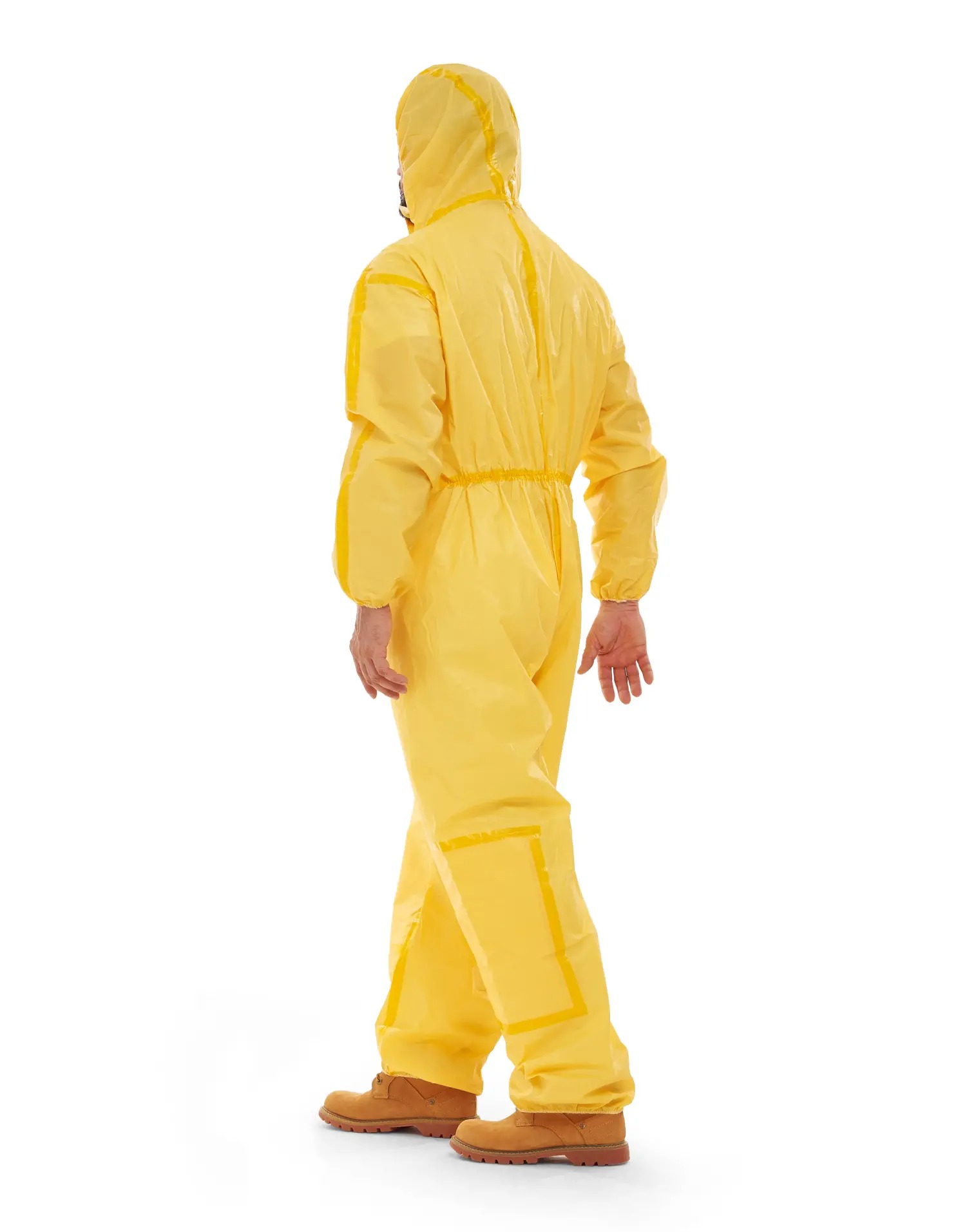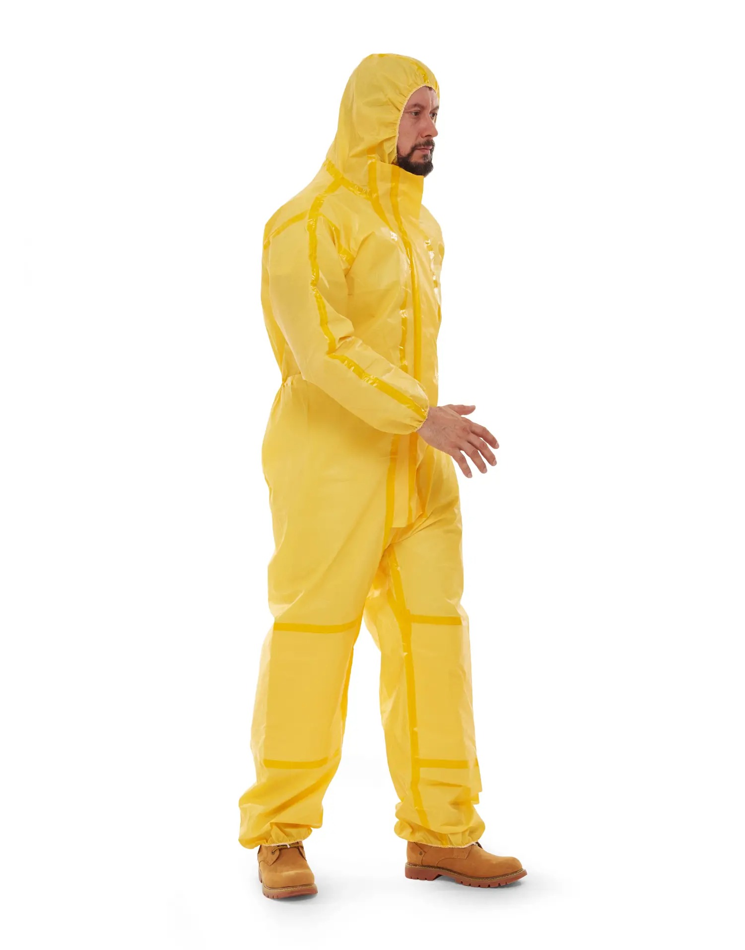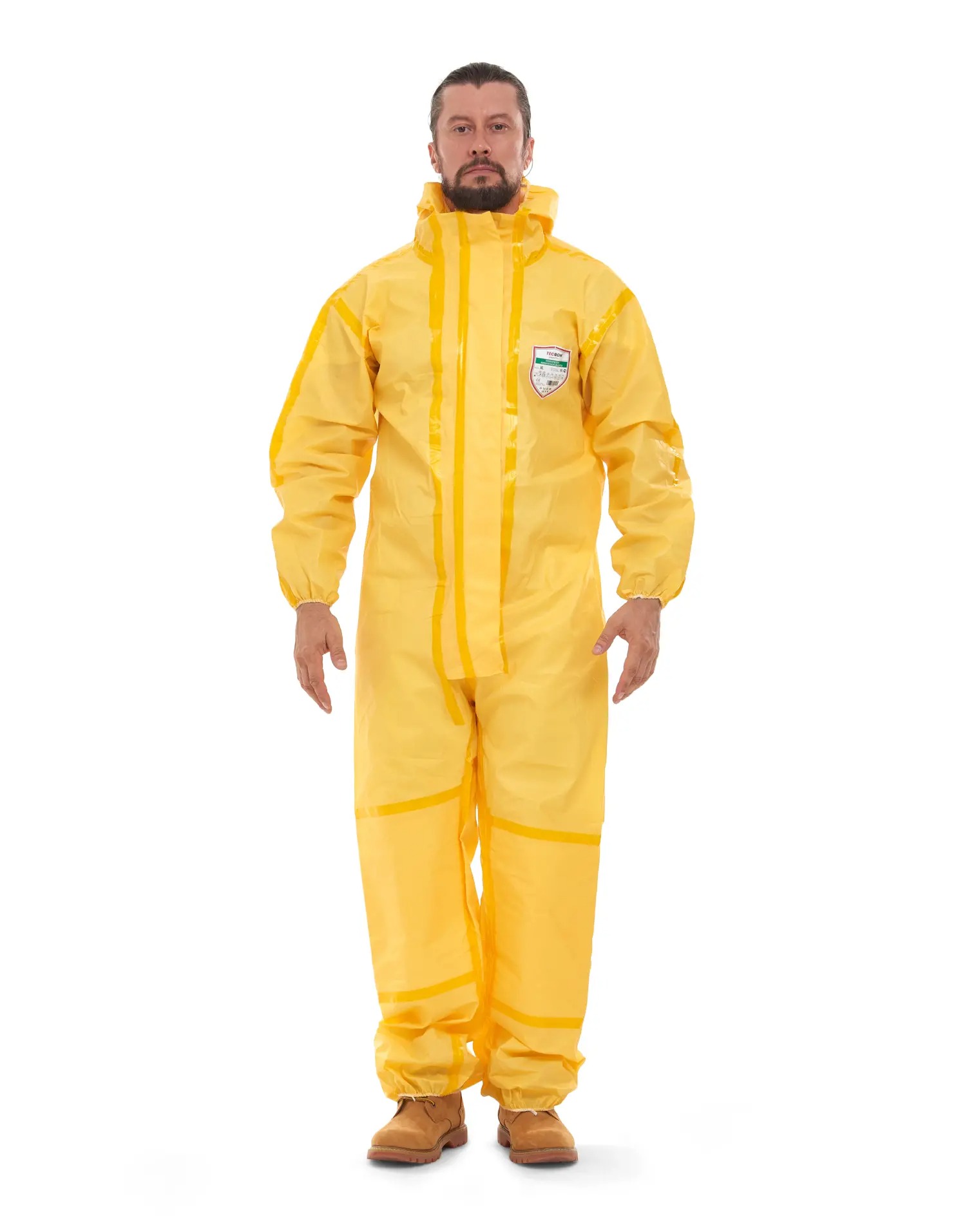 TECRON Chemi Pro — это современный одноразовый комбинезон химической защиты, изготовленный из высокотехнологичного материала на основе многослойного ламинирования полимерной плёнки. Конструкция изделия обеспечивает надежную защиту 3-го и 4-го типов от аэрозолей, брызг химически активных растворов и вредных жидкостей. Комбинезон эффективно защищает от сырой нефти, нефтяных масел, лёгких и тяжёлых фракций, а также от воды.