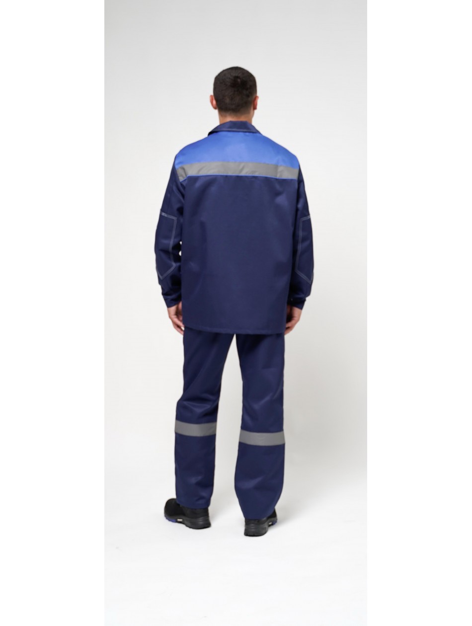 Полочки с нижними накладными карманами. Рукава втачные, низ с манжетой застежкой на петлю и пуговицу и разрезом по локтевому шву, усилительные накладки в области локтей. Кокетки полочек и спинки - из отделочной ткани. Один верхний и два нижних накладных кармана. Брюки прямого силуэта с притачным поясом и шлевками для ремня. Передние половинки брюк с накладными карманами. Усилительные накладки в области коленей. Светоотражающие полосы шириной 5 см на кокетке куртки и на брюках.