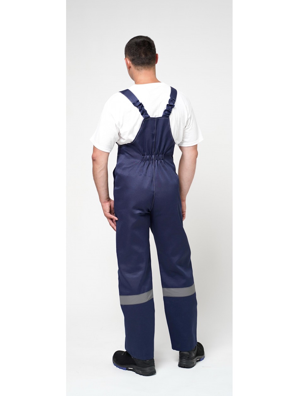 Полукомбинезонс накладными карманами на передних половинках и на нагрудной детали. На спинке кулиса с эластичной тесьмой.Усилительные накладки в области коленей. Светоотражающие полосы шириной 5 см на кокетке куртки и на брюках.