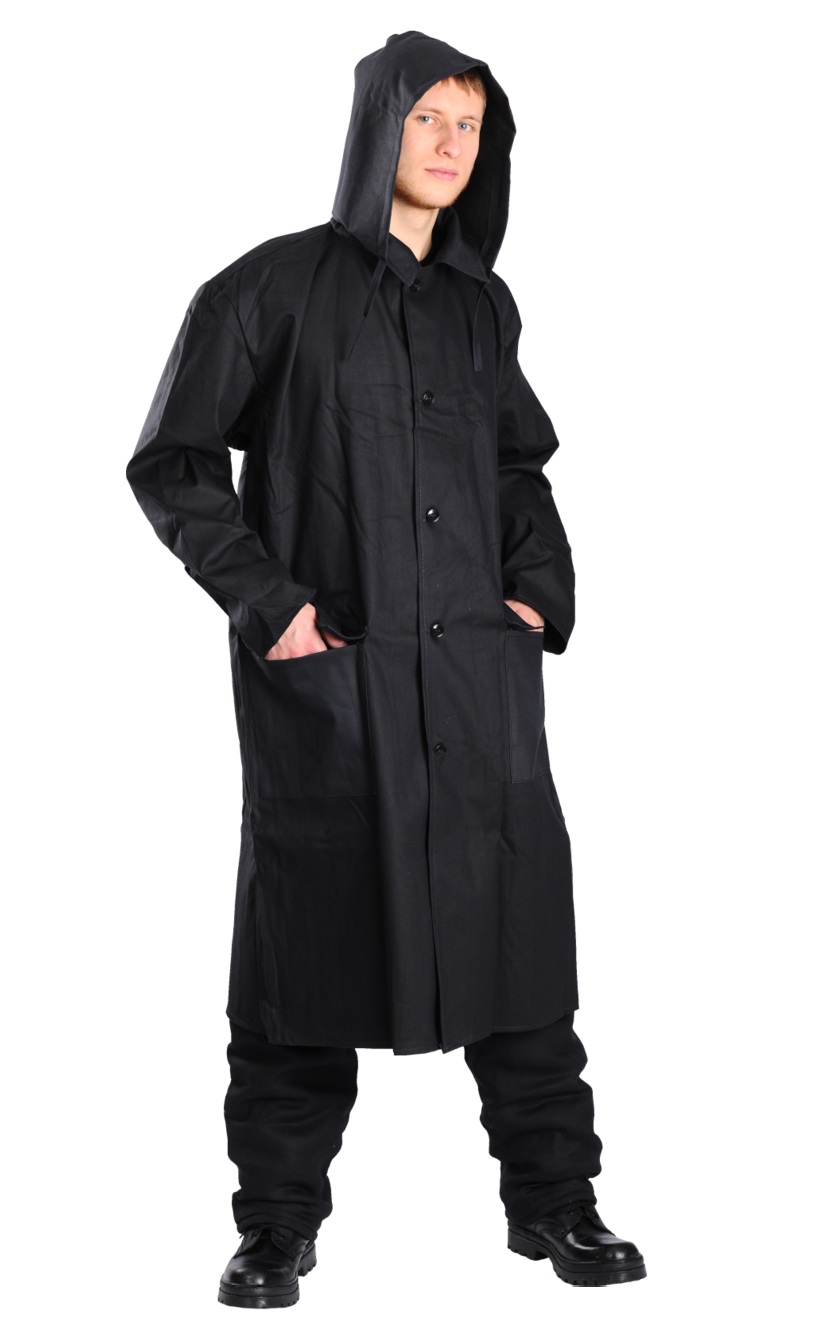 Плащ классический однобортный с двумя накладными карманами с клапанами. Плащ застегивается на пуговицы с потайной ветрозащитной планкой, есть пристегивающийся на пуговицы капюшон.