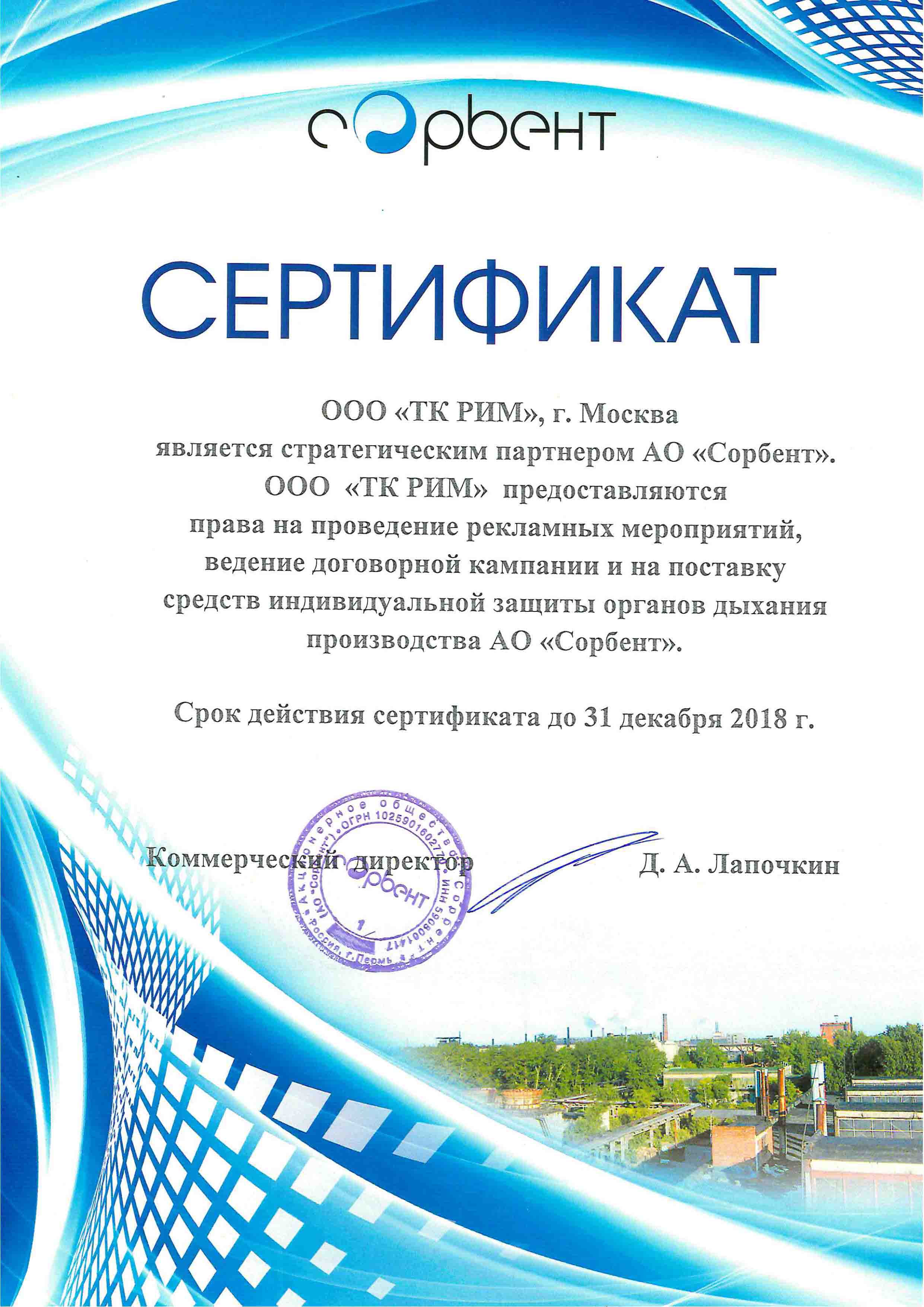 Сертификат подтверждает, что ООО "ТК РИМ" осуществляет продвижение и реализацию средств защиты производства: АО "Сорбент", АО "АРТИ-завод", АО "Тамбовмаш", ОАО "ЭХМЗ им. Н.Д. Зелинского"